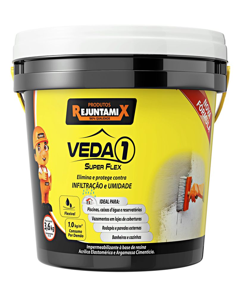 Impermeabilizante Veda 1 3,6kg Cinza Rejuntamix ideal para complementar sua obra vedando e eliminando vazamentos e umidades em áreas como: lajes de coberturas, caixas d'gua, jardineiras, rodapés e piscinas. Importante limpar a superfície com escova de aço e deixar isenta de óleo, devendo está úmida.