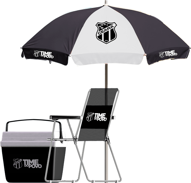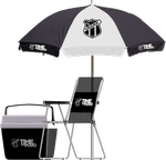 Kit completo para aproveitar praia, piscina ou lazer ao ar livre com conforto e praticidade. Conta com uma caixa térmica(cooler) 34L para conservar bebidas geladas, um guarda-sol em PVC/alumínio com ótima proteção e uma cadeira de praia tipo varanda. Visual preto e branco com identidade Ceará, resistente, funcional e fácil de transportar.