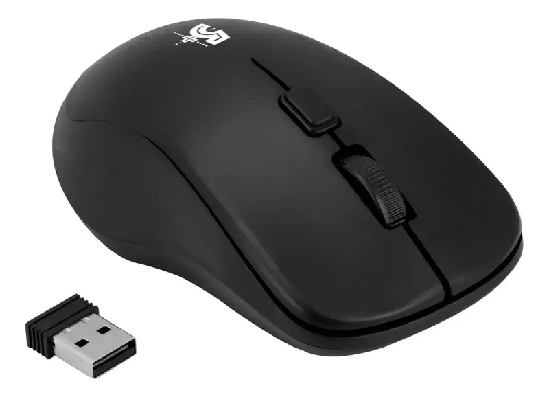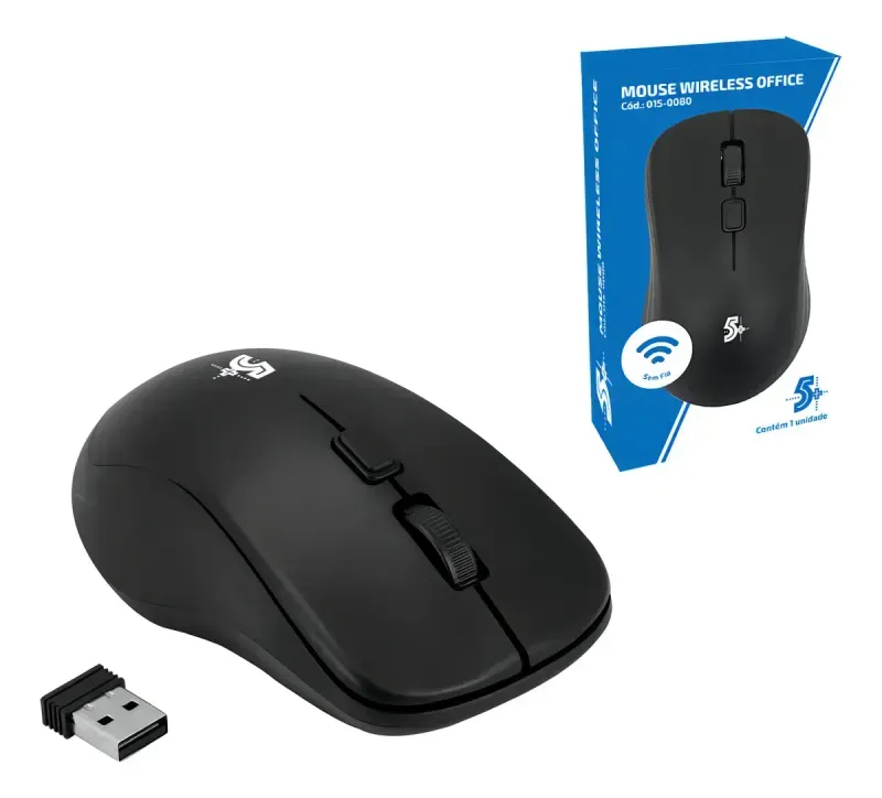 Mouse Wireless Office 2.4GHz Preto 5+: com design ergonômico e conexão estável, oferece conforto e precisão para longas jornadas de trabalho. Sua tecnologia 2.4GHz garante rapidez e praticidade sem fio, ideal para uso diário em ambientes de escritório.