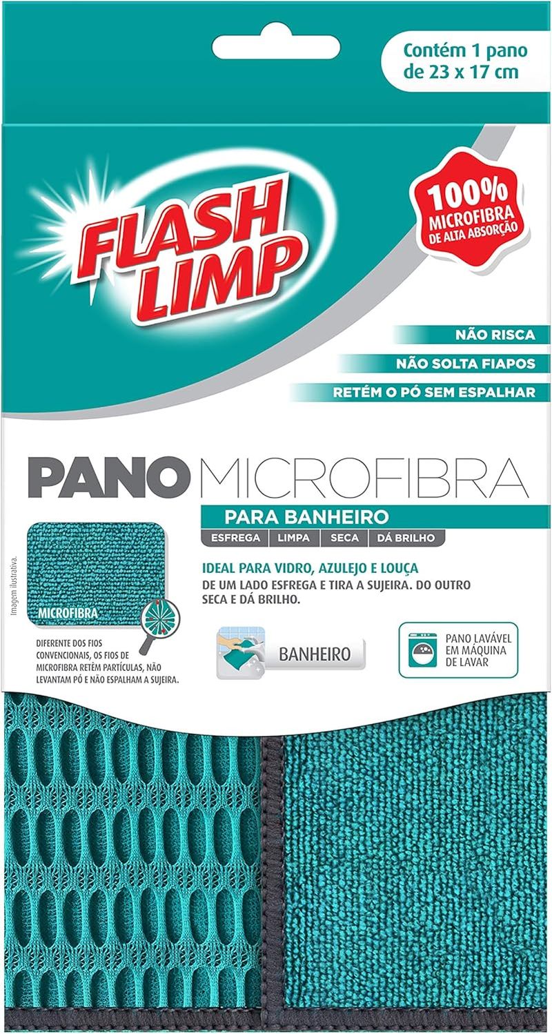 Pano de Microfibra Multiuso para Banheiro Flashlimp. Especial para a limpeza eficiente de banheiros, remove sujeiras com facilidade sem riscar. Super absorvente, resistente e reutilizável, é ideal para deixar pias, vasos e azulejos sempre limpos e brilhando.